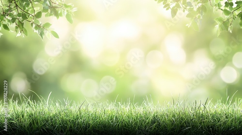 Lush green grass field in soft focus with a sunlit park background, capturing the essence of spring and the beauty of nature.