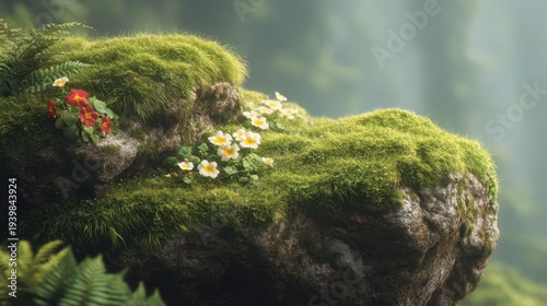 Lush Green Landscape with Vibrant Flowers on a Mossy Rock in a Serene Forest Environment