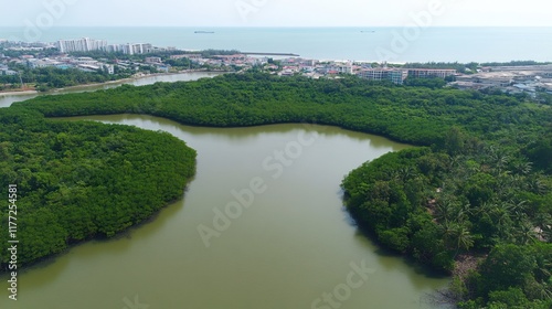mangrove, forest, greenery, water, landscape, aerial, nature, river, ecosystem, marin, habitat, tropical, environment, serenity, tranquil, biodiversity, rural, coastal, jungle, sunlight, peaceful, vegetation, flora, bay, shoreline, wildlife, river bank, wetland, scenic, paradise, tree, blue, sky, city, development, growth, plant, natural, ecological, waterway, remote, lush, serene, beauty, exploration, adventure