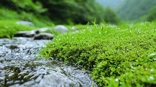 Lush green moss by mountain stream. Nature background image