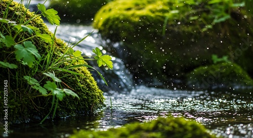 Lush Green Moss Covered Rocks Beside a Cascading Stream Water Droplets Falling Tranquil Nature Scene