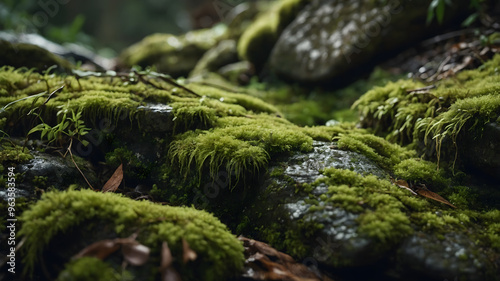 Lush green moss covering stones in a serene forest setting during early morning light