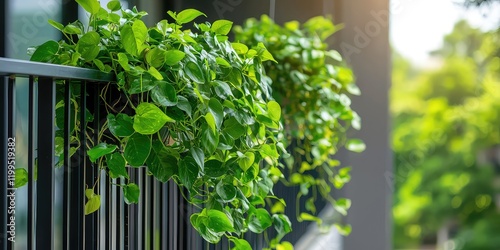 Lush green plants hanging from a balcony railing, adding life to an outdoor space.