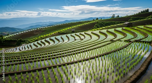 Lush green rice terraces cascade down hillsides under a bright blue sky showcasing agricultural