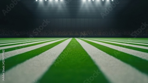 sport, field, green, turf, grass, line, stripes, indoor, stadium, light, bright, depth, perspective, texture, athletic, competition, game, play, entertainment, venue, landscape, arena, modern, view, angle, illumination, environment, design, pattern, empty, space, scenery, background, recreation, leisure, performance, activity, professional, surface, layout, dimension, width, flooring, championship, sportsmanship