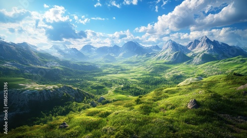 Lush Green Valley Surrounded by Majestic Mountains Under a Blue Sky with Fluffy Clouds