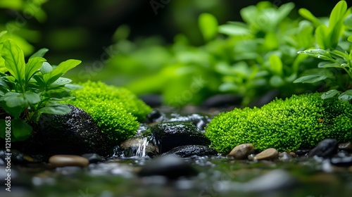 Lush Greenery and Gentle Stream Flowing Through Vibrant Moss Rocks