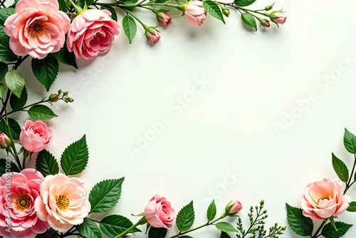 Lush greenery and vibrant flowers create an elegant floral border on a light background ideal for wedding invitations and romantic designs, wedding invitations, light background