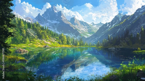 Lush mountain scenery with a sparkling lake reflecting the blue sky, surrounded by vibrant greenery and majestic rugged peaks.