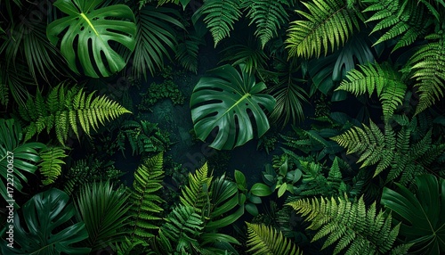 tropical, lush, foliage, plant, green, leaf, fern, monstera, palm, arrangement, pattern, dark, background, fresh, vibrant, nature, design, texture, patterned, decorative, elegant, colourful, beautiful, artistic, composition, botanical, detailed, closeup, image, natural, freshness, exotic, decor, jungle, layout