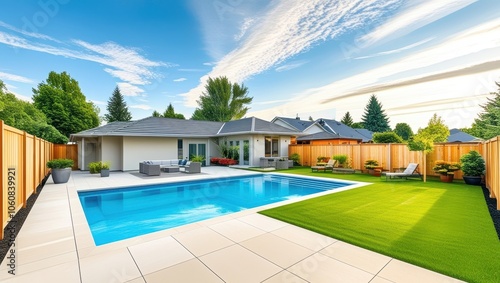 Luxurious backyard, rectangular swimming pool, modern patio furniture, manicured lawn, wooden fence, palm trees, blue sky with wispy clouds, suburban house, outdoor living space, landscape design, poo