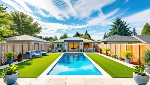 Luxurious backyard, rectangular swimming pool, modern patio furniture, manicured lawn, wooden fence, palm trees, blue sky with wispy clouds, suburban house, outdoor living space, landscape design, poo