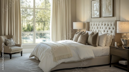 Luxurious bedroom with comfortable furnishings, elegant decor, and a serene setting, designed for relaxation and beauty