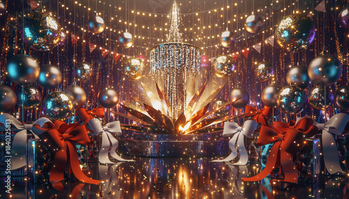 celebration, festive, party, holiday, christmas, new year, event, gala, luxury, opulent, grand, sparkling, glistering, shiny, metallic, gold, silver, light, glowing, bright, illuminated, decoration, ornament, balloon, gift, present, bow, ribbon, elegant, fancy, beautiful, joyful, happy, merry, season, winter, magic, wonder, dream, fantasy, stage, display, show, design, art, abstract, modern, contemporary