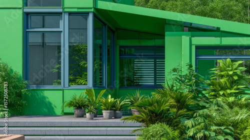 Luxurious green house surrounded by vibrant plants in morning sunlight