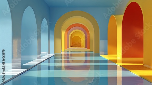 Luxurious interior with arched doorways and reflective floor in shades of blue yellow and orange evoking opulence and grandeur in a modern architectural design