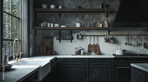 Luxurious kitchen interior with moody dark cabinetry, white countertops, and curated open shelf accessories