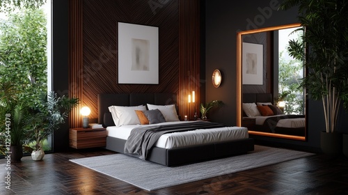 bedchamber, modern, luxury, dark, wood, mirror, garden, plant, interior, design, home, decor, room, house, apartment, style, elegant, comfortable, roomy, relaxing, serene, peaceful, tranquil, cosy, chic, sophisticated, minimalist, contemporary, rustic, natural, green, light, window, floor, furniture, bed, lamp, carpet, wall, view, nature, lifestyle, comfort, ambience, aesthetic, space, living