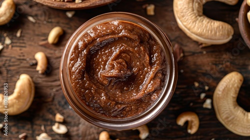 Luxurious nut paste in a transparent jar, viewed from above, with cashew nuts and wooden accents for a natural feel. High contrast, isolated setup