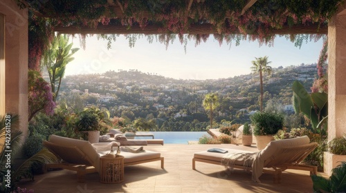 patio, luxury, hillside, view, swimming pool, landscape, greenery, plant, sunlight, relaxation, serenity, calmness, deck, furniture, lounge, chair, cushion, decor, design, warm, tone, stone, wooden, detail, architecture, modern, elegant, home, house, estate, property, villa, vacation, travel, holiday, garden, poolside, sunbed, viewpoint, scenic, nature, mountain, city, village, town, urban