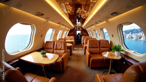 Luxurious private jet interior with plush leather seating, gold-tone fixtures, and panoramic windows, offering an opulent travel experience. High-resolution, realistic photo, 8k.