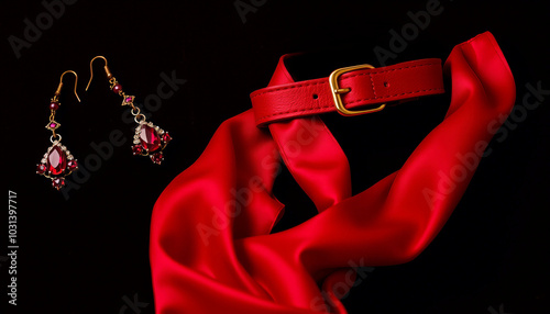 Luxurious red accessories displayed against a black background, highlighting exquisite earrings and a flowing silk scarf. Perfect for showcasing elegance, style, and fashion aesthetics.