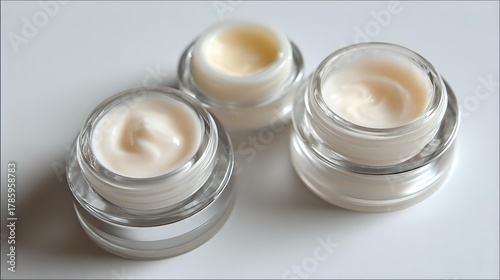 Luxurious skincare cream samples in transparent glass jars on white background, showcasing rich texture of premium cosmetic products for beauty industry.