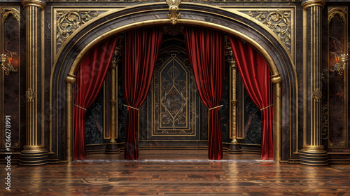 Luxurious theater stage with red curtains and ornate golden details, showcasing elegant backdrop and polished wooden floor, perfect for performances and events