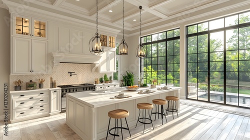 Luxurious white kitchen design with large island, hardwood flooring, and natural light flooding through, realistic 8K resolution,