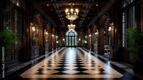 Luxurious wooden hallway with checkered marble floor, elegant interior design