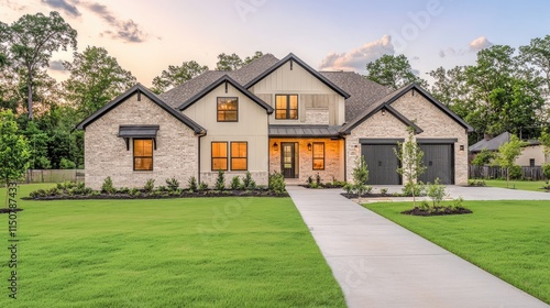 Luxury farmhouse home with stone exterior, large windows, and landscaped lawn at dusk.