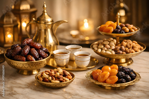 Luxury Ramadan Setup with Dates, Nuts and Arabic Coffee