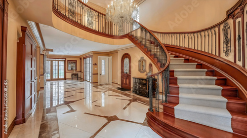Luxury Staircase with Wooden Railing and Chandelier in Spacious Foyer – Elegant Home Design with Marble Floor, Bright Lighting, and Sophisticated Decor in Upscale Residence