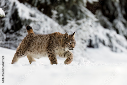 Lynx in winter. Young Eurasian lynx, Lynx lynx, creeps in snowy coniferous forest. Beautiful wild cat in nature. Cute animal with spotted orange fur. Beast of prey in frosty day. Predator in habitat.