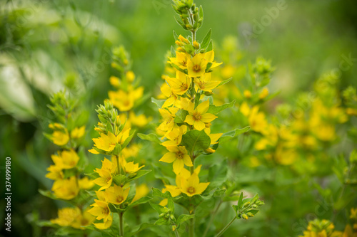 Lysimachia blooms in beautiful yellow flowers on a sunny summer day. Selective soft focus.