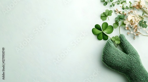 macro, photograph, leprechaun, green, glove, luck, clover, isolated, light, background, texture, nature, plant, irish, celtic, mystical, fantasy, magic, whimsical, small, closeup, detail, pattern, shape, organic, natural, bright, vibrant, fresh, spring, meadow, field, garden, leaf, flora, vegetation, environment, charme, fortune, symbol, shamrock, emerald, lucky, amulet, superstition, enchanted, fairy tale, folklore