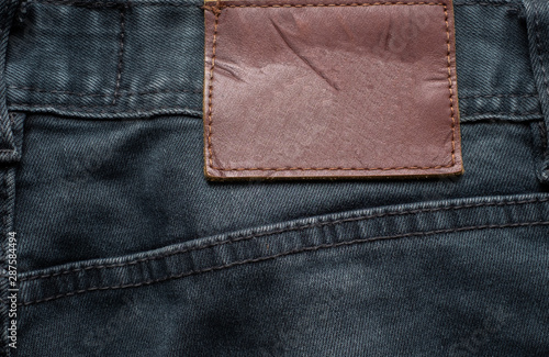 Macro, Close-up of blank leather label on new denim black jeans trousers. fashion and retro stlye on background.