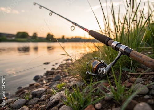 fishing pole, lake, nature, sunset, fishing, outdoors, water, closeup, detail, rod, reel, line, tackle, calm water, golden hour, summer, macro, closeup, fishing gear, angler, fishing trip, relaxation, peaceful, serene, landscape, photo, image, photo, royalty free, hi-res, water droplets, grass, pebble, texture, background, environment, wildlife, nature scene, outdoor recreation, leisure