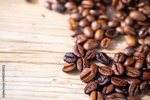 Macro close-up of roasted coffee beans scattered on a light wooden surface, showcasing rich textures, natural imperfections, and warm tones with a shallow depth of field.
