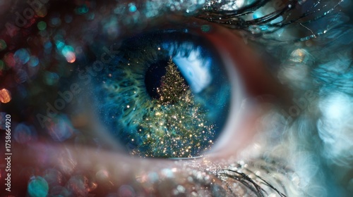 Macro photo of an eye in detail with the reflection of a Christmas tree