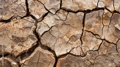 Macro Photograph of Parched Earth Texture: Extreme Close-Up Revealing Deep Fissures and Geological Stratification Under Intense Sunlight
