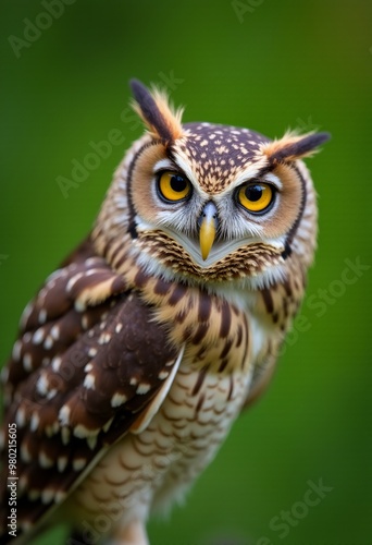 Macro Photography: A Close-Up of a Curious Little Brown Owl with Bright Yellow Eyes against a Vibrant Green Background