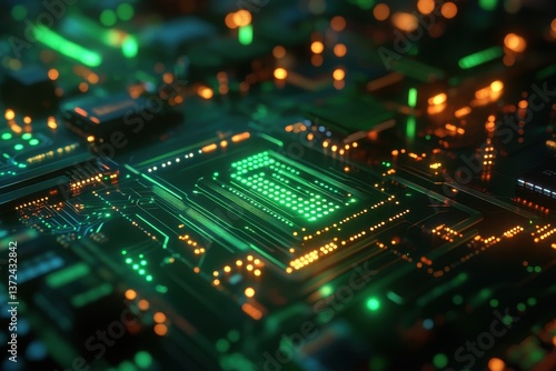 Macro shot of a detailed circuit board with green and orange lights. Illustrates technology, artificial intelligence, data, networks, and innovation.