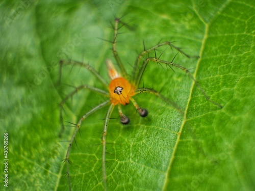 Macro the spider behind has a yellow body, with a green color, perched on a green leaf.