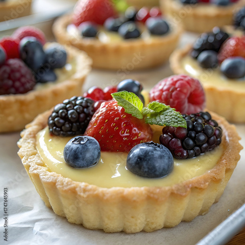 macro view of fruit tarts filled with custard and fresh berries