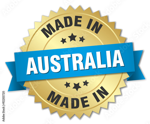 made in Australia gold badge with blue ribbon