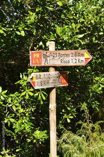 Madeira, Portugal - September 2017:Signpost for the levada walk to the 25 Fontes and the Risco waterfall