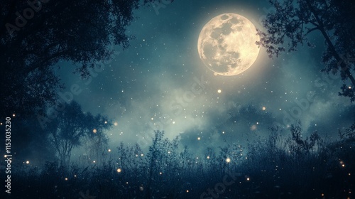 Magical forest at night with a full moon and fireflies