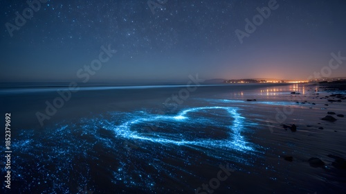 Magical heart shaped bioluminescent waves on a serene beach at night