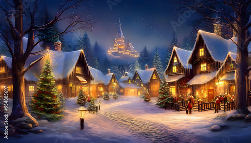 Magical Snow-Covered Christmas Village Illuminated by Festive Evening Lights
